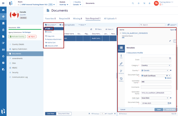 - Select the document and click the Document drop-down to edit the document.