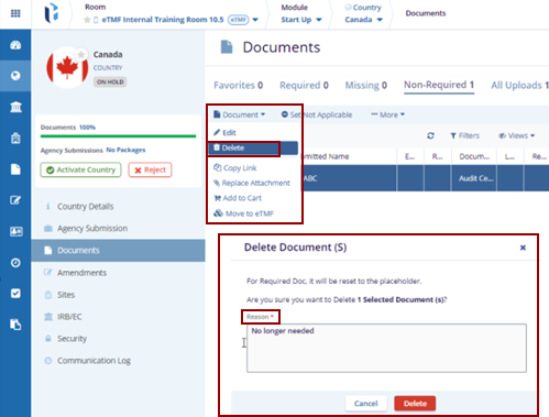 - Click the Delete option, and the Delete Document(s) pop-up window is