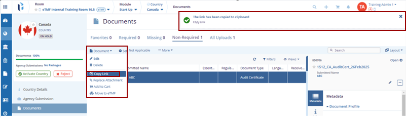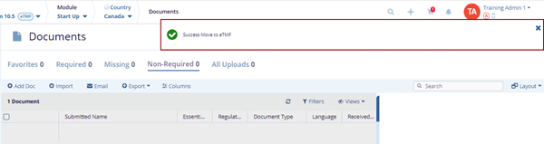- The Success Move to eTMF notification message is displayed on the top right of the