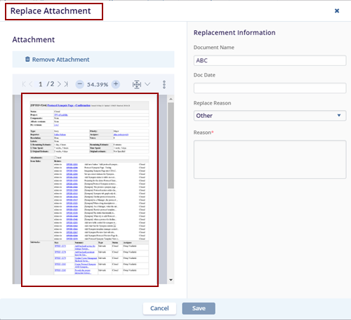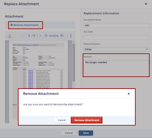 - To remove the attachment, the user needs to provide a reason in the Reason box and click Remove Attachment.