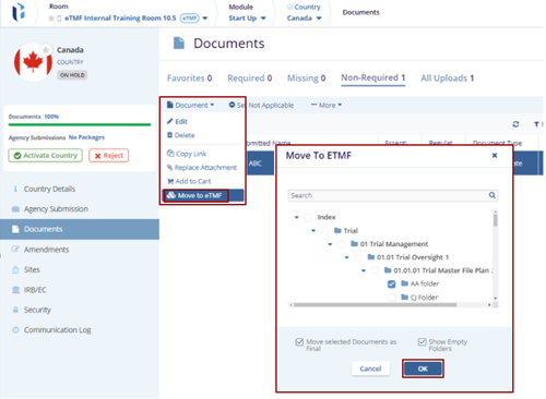 - Click the Move To eTMF option. The Move To eTMF pop-up window is displayed with the list of available folders in eTMF.