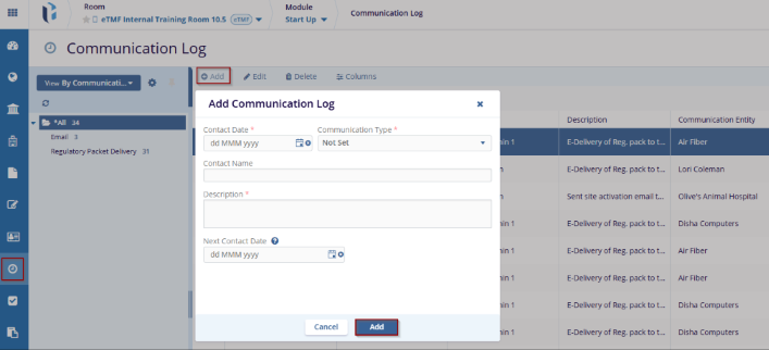 - Click the Add button displayed on the top menu bar, this will open the Add Communication Log window.