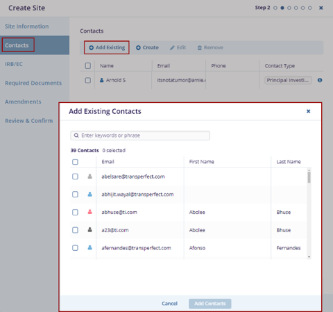 - The Contact’s tab is displayed on the Create Site pop-up window.