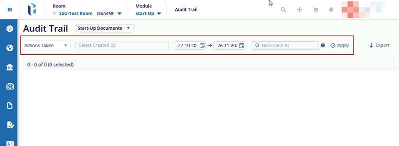• User Interface for Start-Up and eTMF documents: When the audit trail for Start-Up and eTMF Documents is retrieved, the data is presented in the following columns.