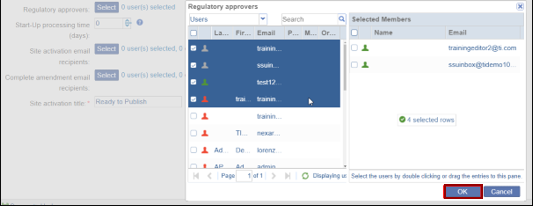 • On the Regulatory Approvers window, drag & drop users to the selected members’ section and click on the OK button.