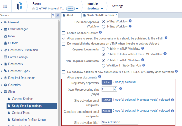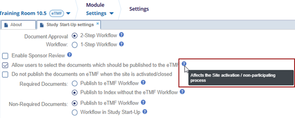 1. Publish to eTMF Workflow : When this checkbox is enabled, required documents for Site Activation undergo an additional QC step as they are published to the eTMF Workflow. This step is common for users who only have a 1-step review process in SSU.