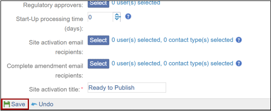 • Site activation email recipients: When the site is activated, recipients will get an email notification. Recipients could be a CRA, Central Lab, etc.