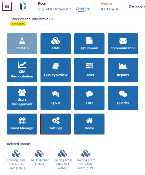 3. On the room landing page, click on the Waffle menu and select the Settings module.