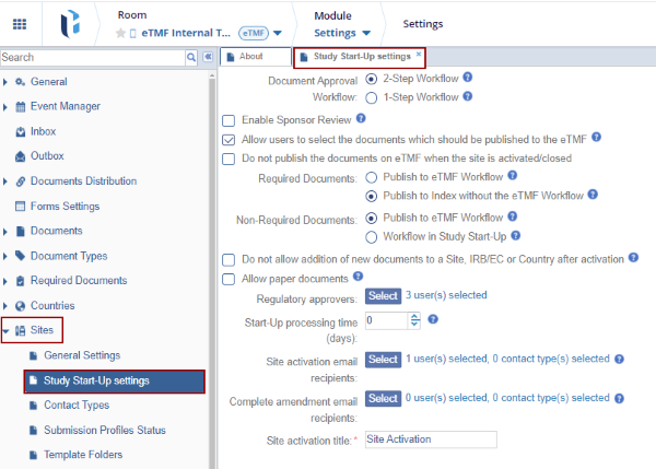 4. From the left-hand navigation pane, expand the Sites folder and select Study Start-Up settings.
