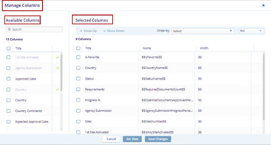 2. On the Manage Columns window, the "Available Columns" section lists the column titles, while the "Selected Columns" section shows the chosen columns.