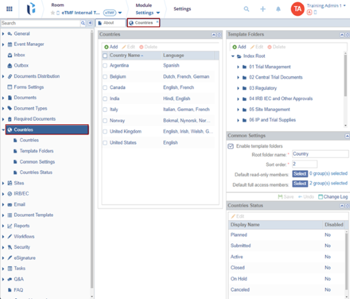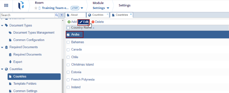 Note: Once documents are stored in the room’s index folders, countries with associated documents cannot be deleted. However, the user can continue adding and editing entries in the Countries list as the study progresses.