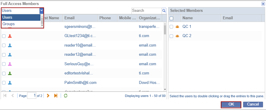 - The Full Access Members window is displayed in order to add Users/Groups by dragging the entries or by selecting them.