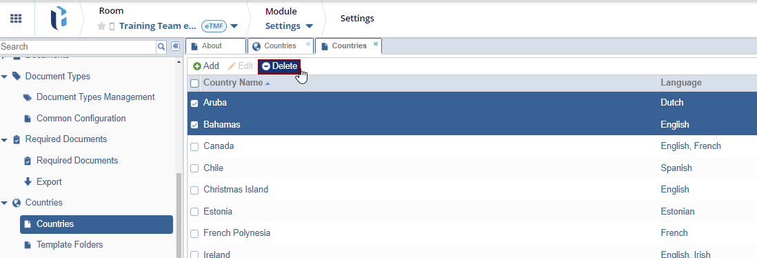 Note: Once documents are stored in the room’s index folders, countries with associated documents cannot be deleted. However, the user can continue adding and editing entries in the Countries list as the study progresses.