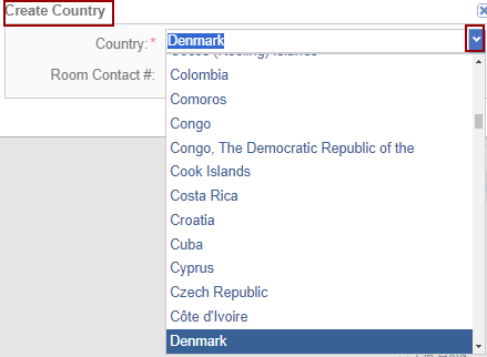 - Click the dropdown arrow at the right end of the Country field. An alphabetized list of countries is populated to select from.