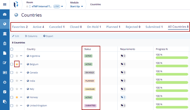 The Start-Up Countries tab, accessible from the left toggling menu, allows document setup for countries linked to sites. The Countries Dashboard displays country statuses at the top, with a central Grid Pane for detailed viewing.