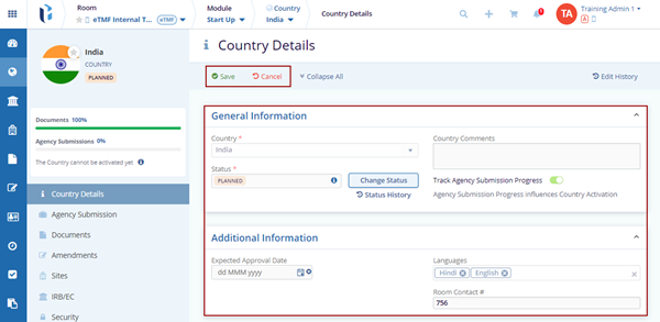The Country Details page displays a progress bar for - the Documents and the Agency Submission. Below the progress bar, the page displays the tabs/links for Agency Submission, Documents, Amendments, Sites, IRB/EC, Security, and Communication log. Refer to the screenshot below.
