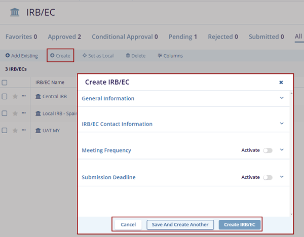 - Click Create a Create IRB/EC