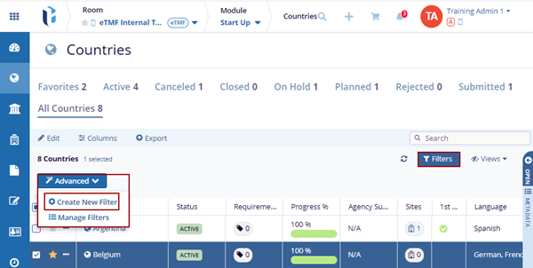 - Select – displays the countries added based on the created filter.
