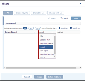 Select an operator from the available dropdown list. Based on the selected operator, other fields such as "Equal" and "Not Set" will be populated accordingly.