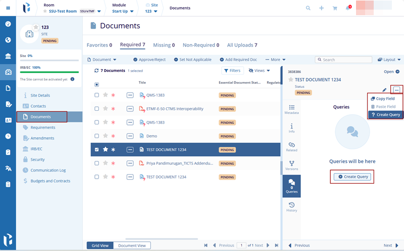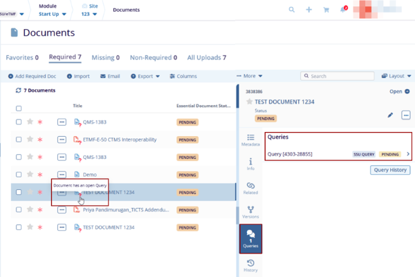 6. Refresh the page, and the newly created query should be displayed with Pending Status in the Queries tab in the quick view panel, and the Query Icon should be displayed near the Document icon in the grid view.