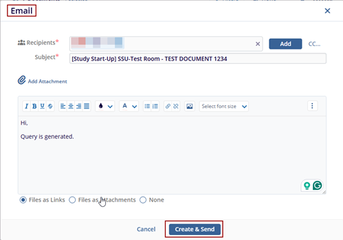 4. Click the Create Query button. In the Email pop-up window, fill in the Required action and click the Create & Send button.