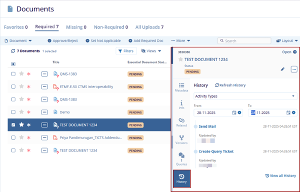 7. The History tab in the quick view panel displays the Query Creation and Send Mail records.
