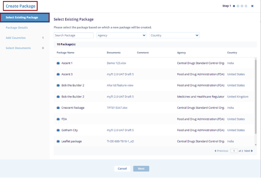 Follow the steps in the Add Agency Submission section to update the Package Details, Add Countries, and Select Documents sections for the existing package.