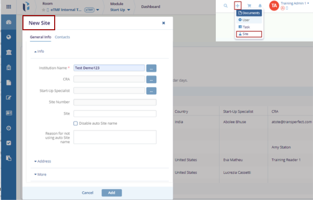 - Click the Site option, the New Site screen is displayed.