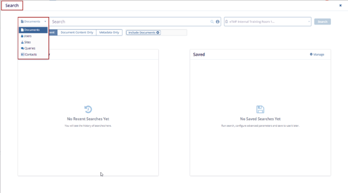 Expand the Documents arrow to search by Documents, Users, Sites, Queries, and Contacts.