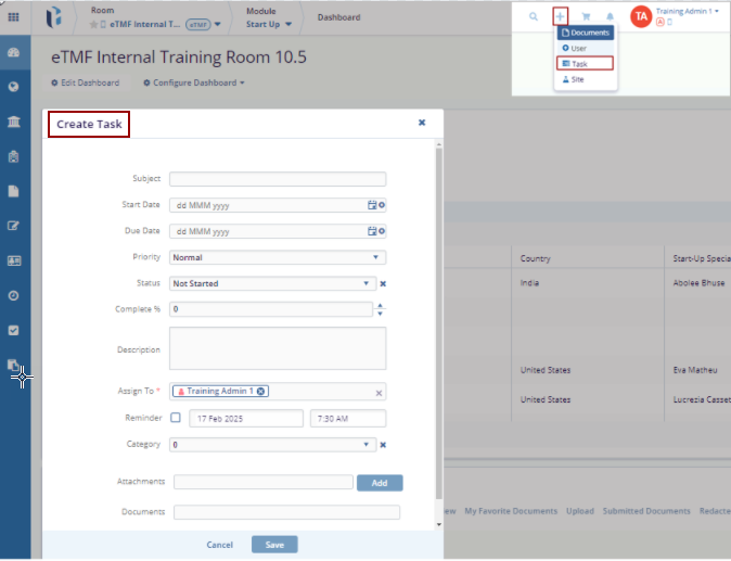 - Click the Task option, the Create Task screen is displayed.