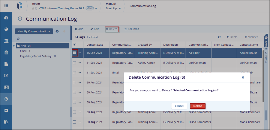 The delete button allows the user to Delete the Communication Log.