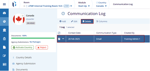 - Select the checkbox of the log to delete. This enables the Delete button to be