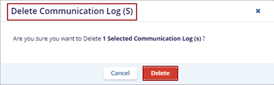 - Click the Delete button. The Delete Communication Log (s) dialog box is displayed with the Cancel and Delete buttons.