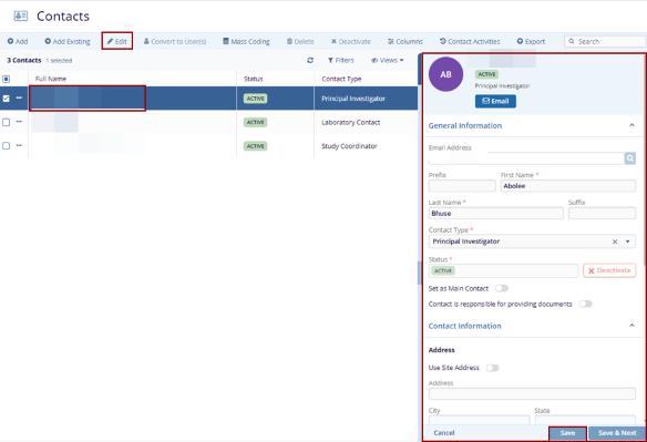 - Select a contact and click the Edit button in the menu bar to open the Contact Profile in the metadata panel on the right side of the screen.