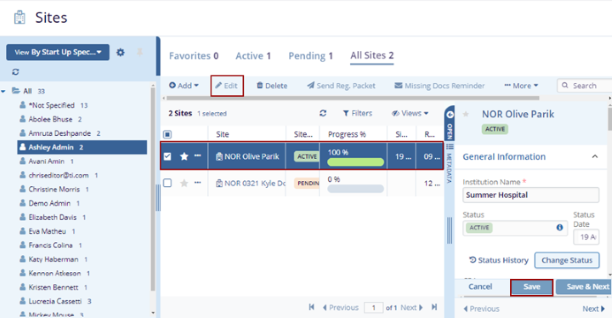 - Make edits to the site details and click on the Save button. The changes get saved.