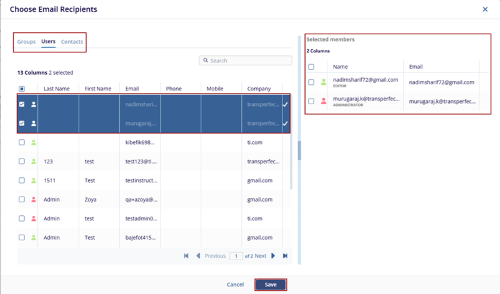 - Double-click on the Users, Groups, and Contacts from the list. The selected users were added to the right pane (Selected members) of the Choose Email Recipients screen.