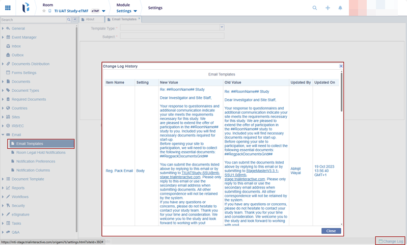 The Change Log option, located at the bottom right of the screen, displays a record of the Email Templates. It includes columns for Item Name, Setting, New Value, Old Value, Updated By, and Updated On (with the timestamp), and a Close button.