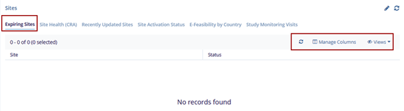 The Expiring Sites tab provides a list of all sites that have an upcoming expiration date. This tab includes columns displaying details such as Expiration Date, Site, Principal Investigator, Status, Main Contact, and Main Contact Phone. Users can further customize the view by clicking Manage Columns to add or remove specific columns as needed. This feature helps users track sites with approaching expiration dates, ensuring timely actions can be taken.