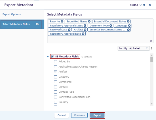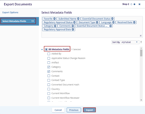 2. The Export Documents pop-up screen is displayed with the ‘Export Options’ and ‘Select Metadata Fields’ tab.