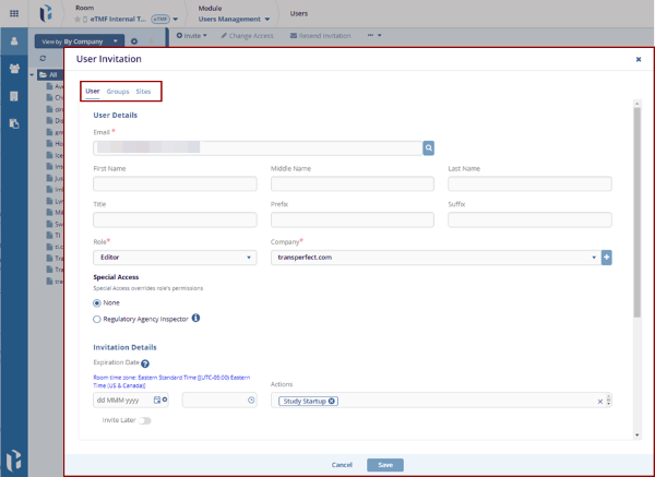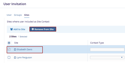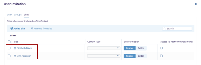 - Click the Sites tab on the User Invitation form.