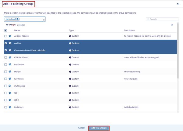 - Select the required groups, click Add to Groups, and view the selected groups on the Groups tab.
