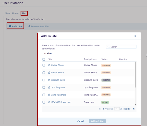 - Select the users and click the Add to Site option at the bottom of the Add to Site pop-up window.