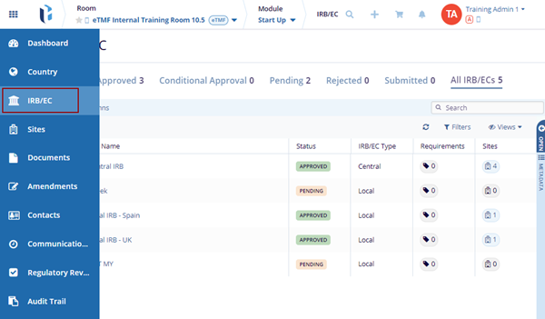 - Status – Displays if the IRB/EC is Approved, Submitted, Pending, or Conditional Approval.