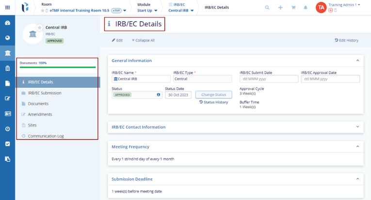 - Click the Save button on the top of the menu bar on the IRB/EC Details page.