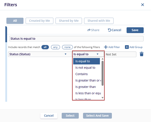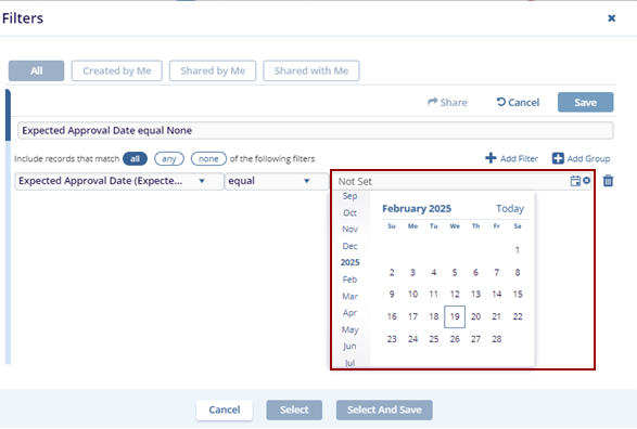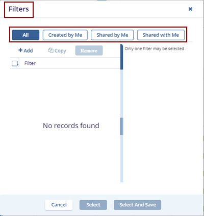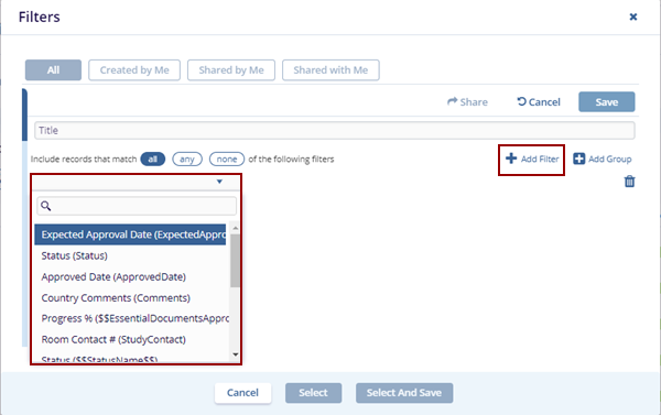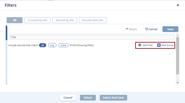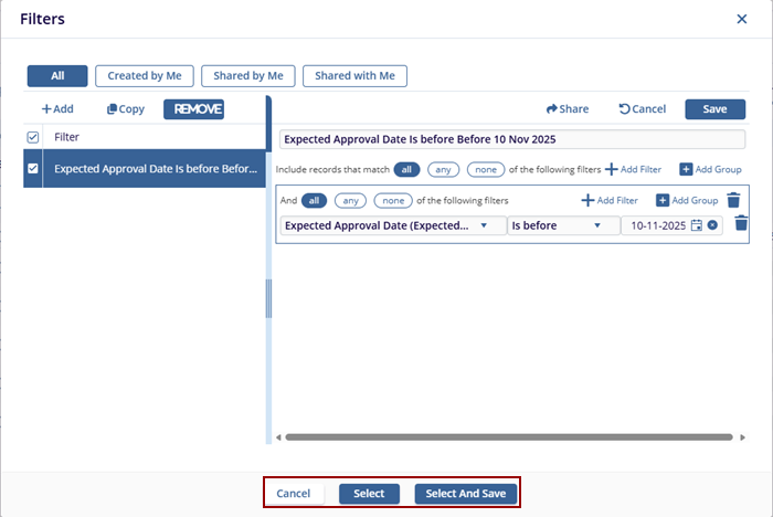 7. Once the filter is created, the Cancel, Select, or Select and Save buttons get activated.