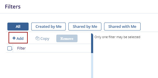 2. On the Filters window, click on the +Add button. The user is directed to the filter page, where the user can add a Filter or Group.