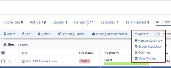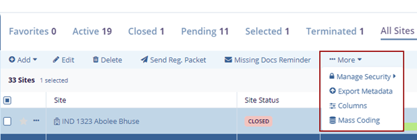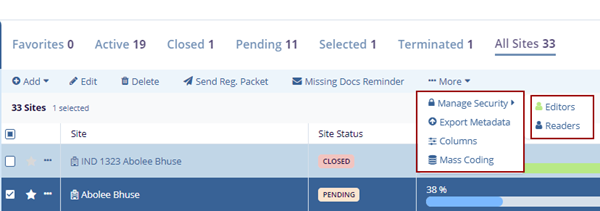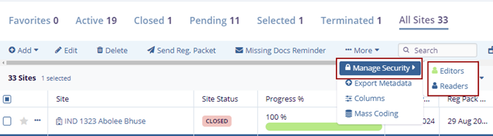1. Select a site by clicking on the checkbox, clicking the More dropdown button, and selecting the Manage Security option.