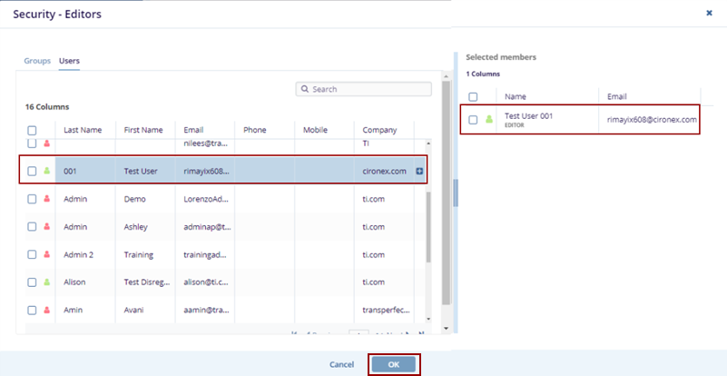 4. The Security – Editors screen is displayed with the Groups and Users tab, hover the mouse over the names to highlight in blue and view the Plus icon next to each username.