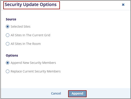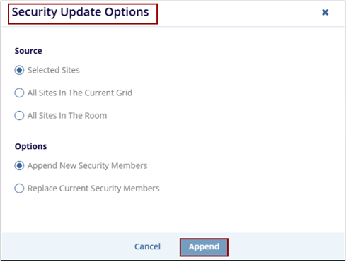 7. A Security Update Options popup window is displayed with Cancel and Append buttons.