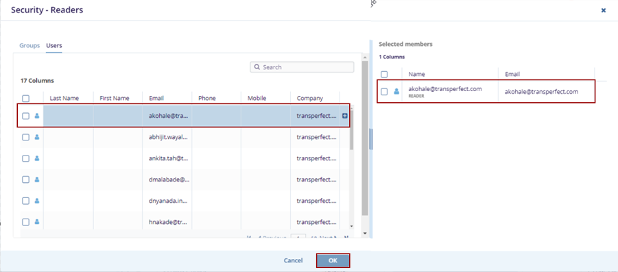 14. Click the Plus icon to view the name on the right side – Selected Members pane on the right side. The user can also drag and drop the name if required.